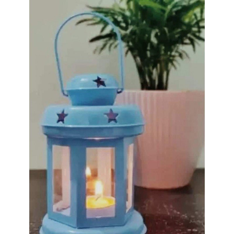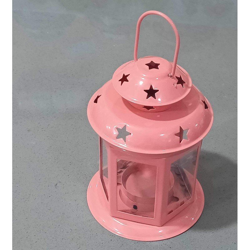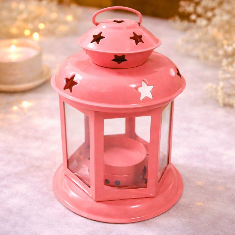لفانوس مزين بنجوم على سطحه ويحتوي على شمعة داخله، مما يضيف إليه إضاءة وجو دافئ وجذاب. الفانوس موضوع على طاولة بيضاء مستديرة ذات زخارف معدنية مميزة، ومن حوله نباتات خضراء إضافة إلى عناصر ديكورية أخرى. الإضاءة الخافتة للشمعة داخل الفانوس تعطي إحساسًا بالهدوء والراحة. هذا الفانوس المعدني الأحمر يمكن أن يضيف لمسة جمالية وجو دافئ إلى أي مكان يتم وضعه فيه.