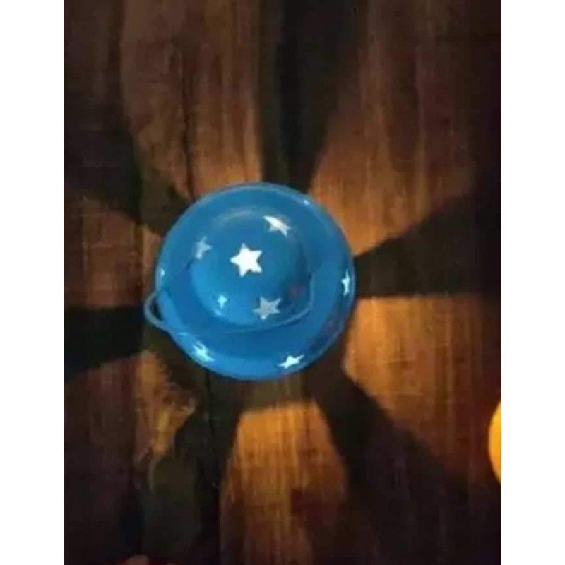 لفانوس مزين بنجوم على سطحه ويحتوي على شمعة داخله، مما يضيف إليه إضاءة وجو دافئ وجذاب. الفانوس موضوع على طاولة بيضاء مستديرة ذات زخارف معدنية مميزة، ومن حوله نباتات خضراء إضافة إلى عناصر ديكورية أخرى. الإضاءة الخافتة للشمعة داخل الفانوس تعطي إحساسًا بالهدوء والراحة. هذا الفانوس المعدني الأحمر يمكن أن يضيف لمسة جمالية وجو دافئ إلى أي مكان يتم وضعه فيه.