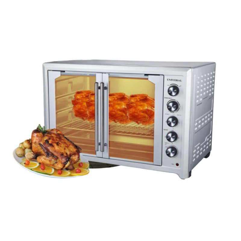 ✅ فرن وشواية كهرباء ببابين من ينيفيرسال بلس حجم 95 لتر ✅ اللون: سكني . ✅ مع شواية (مشواة دوارة) ومروحة الحمل الحراري لخبز مثالي ✅صينية عدد 2 ✅ صنع في الصين