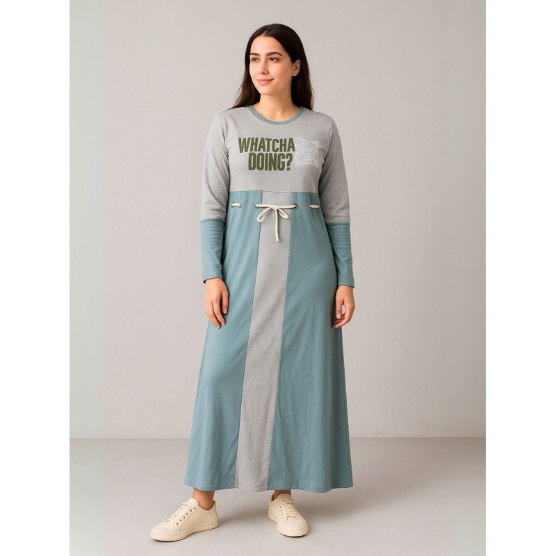 فستان قطني بيتي للنساء لون أخضر ورمادي