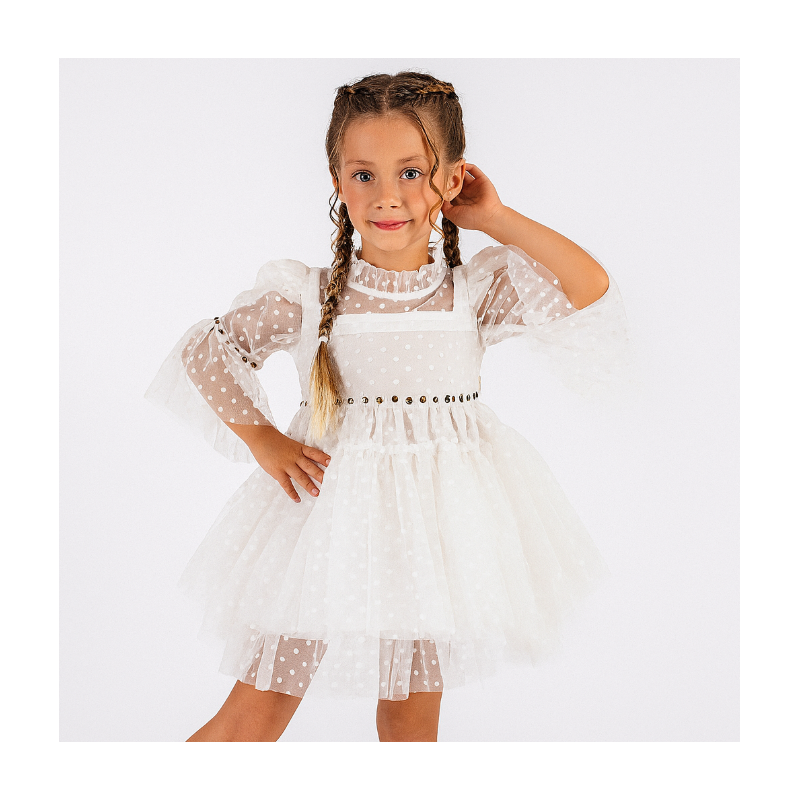 اجعلي طفلتك تتألق بإطلالة ملكية مع هذا الفستان الأبيض الساحر! ✅ تصميم راقٍ بطبقات من التول الناعم لإضفاء لمسة من الأناقة والفخامة ✅ أكمام شفافة مزينة بنقاط ناعمة تمنح مظهرًا عصريًا مميزًا ✅ قماش خفيف ومريح مناسب للحفلات والمناسبات الخاصة ✅ لون أبيض نقي يضفي براءة وجمالًا على إطلالة طفلتك