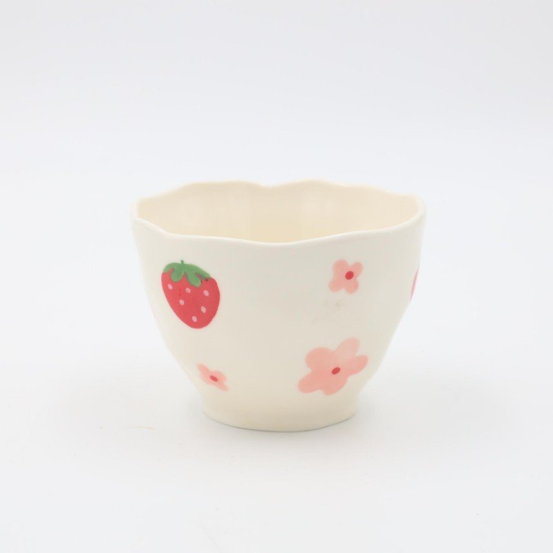 مواصفات المنتج: ✅ نوع المنتج: فنجان بدون يد ✅ طريقة الصنع: هاند ميد ✅ التصميم: ورود وفراولة ✅ اللون: أوف وايت مع رسومات ملونة ✅ الاستخدام: مشروبات ساخنة / ديكور