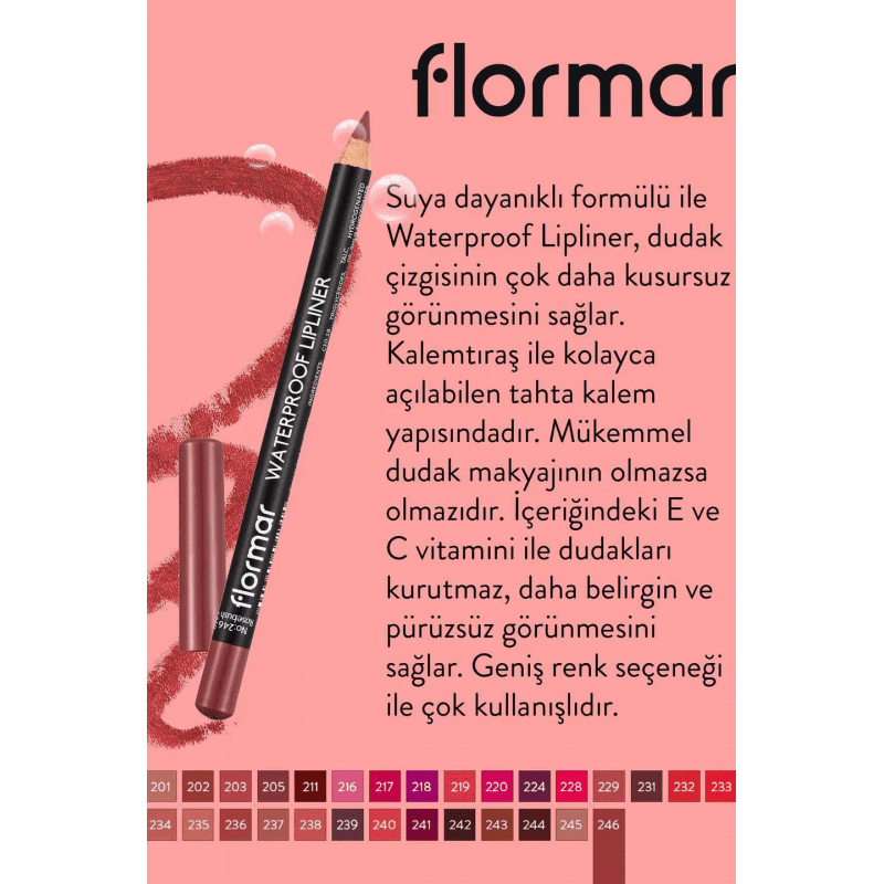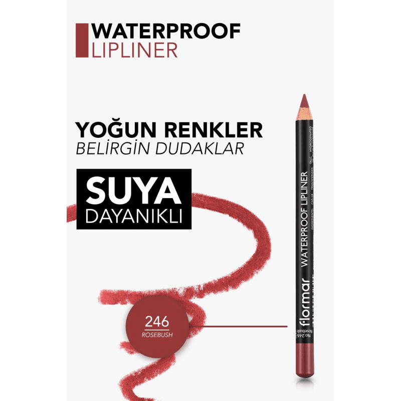 قلم تحديد الشفاه Waterproof Lipliner بدرجة Rosebush 246 يمنحك لوناً كثيفاً وثابتاً يبرز جمال الشفاه بدقة. تركيبته مقاومة للماء تجعله يدوم لساعات طويلة دون أن يتلاشى، مما يجعله مثالياً للإطلالات اليومية والمناسبات.