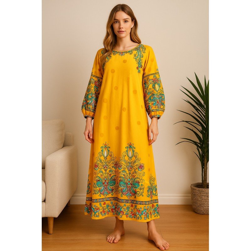 ✅قميص بيتي للنساء . ✅تأتي بتصميم طويل وبأكمام طويلة . ✅اللون : أصفر . ✅القماش : 100% بوليستر . ✅جودة عالية وممتازة . ✅صنع في الصين .