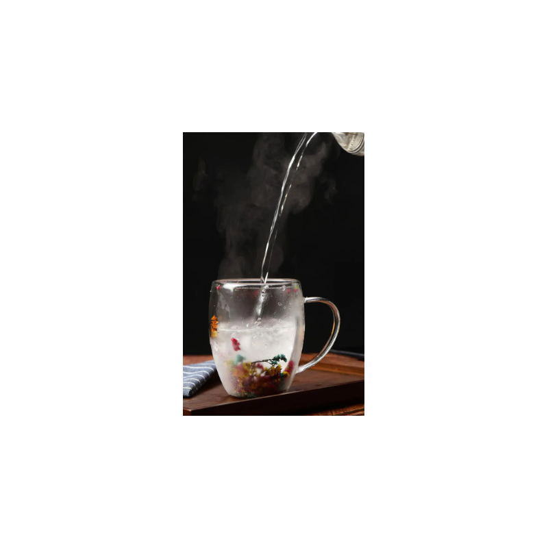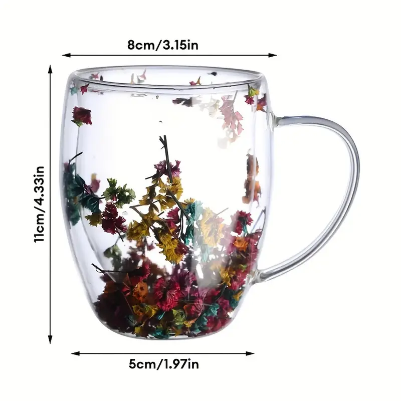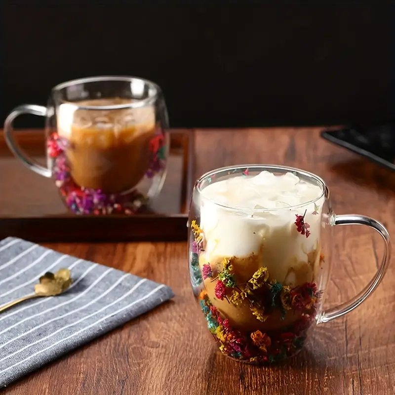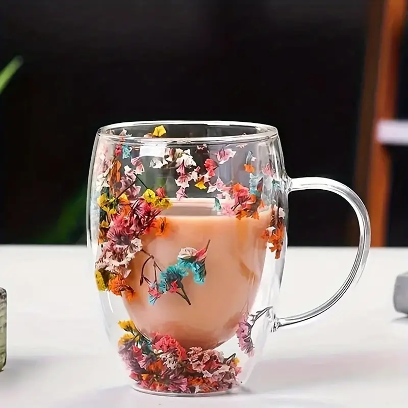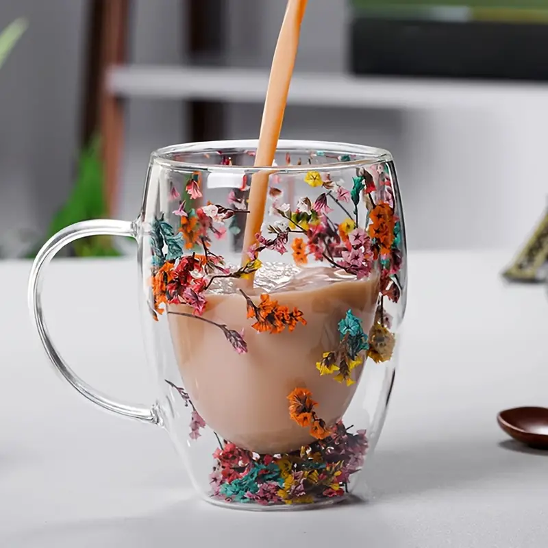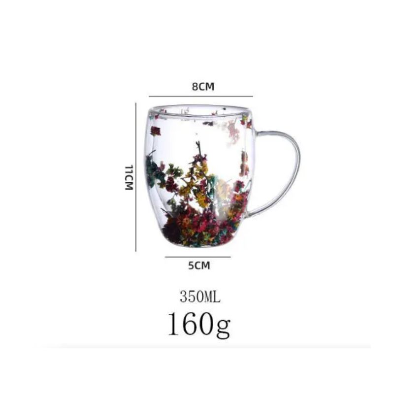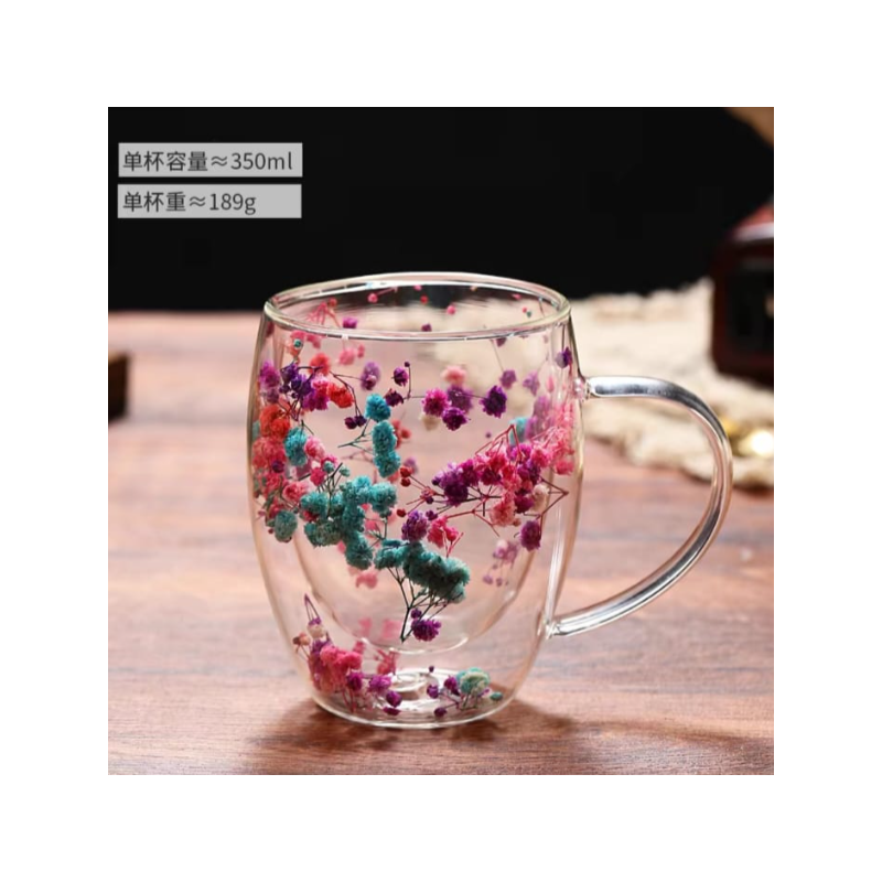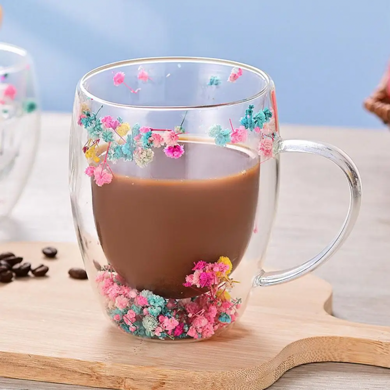 ✅كوب وكاسة دبل جلاس (طبقتين) شفاف بينهما ورد مع مقبض