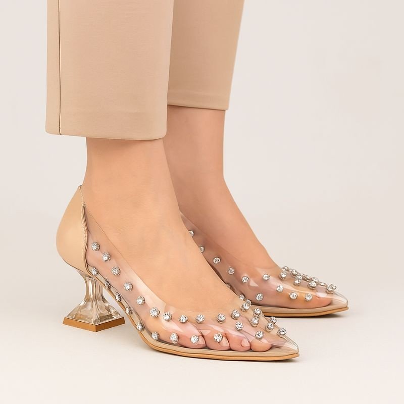 تصميم عصري: يعكس الموضة الحديثة ويتميز بالكعب الشفاف الذي يضيف لمسة من العصرية والجاذبية.