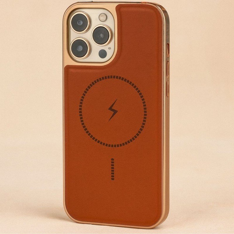 كفر جوال ايفون 14 برو ماكس فخم بتصميم جلد مميز متين مع حلقة تدعم الماج سيف لون بني
