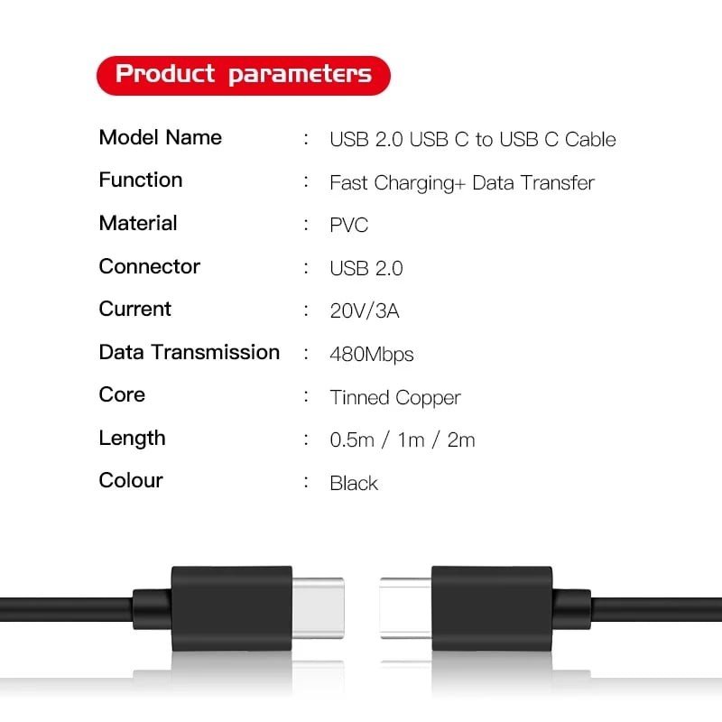 كابل سلك تايب سي الطرفين سريع الشحن 60 واط 3 امبير و نقل البيانات السريع بين الأجهزة والكمبيوتر 480 ميجا في الثانية يدعم مخارج محولات الشواحن يو اس بي سي و لابتوب وتابلت تايب سي | 60W PD Cable Type-C To Type C 3A Fast Charge Cable USB-C Quick Charger Cable 480Mbps Data transfer Phone Cable For Xiaomi Redmi 8 9 note 9 LG G7 v40 huawei mate 20 htc U12 pro