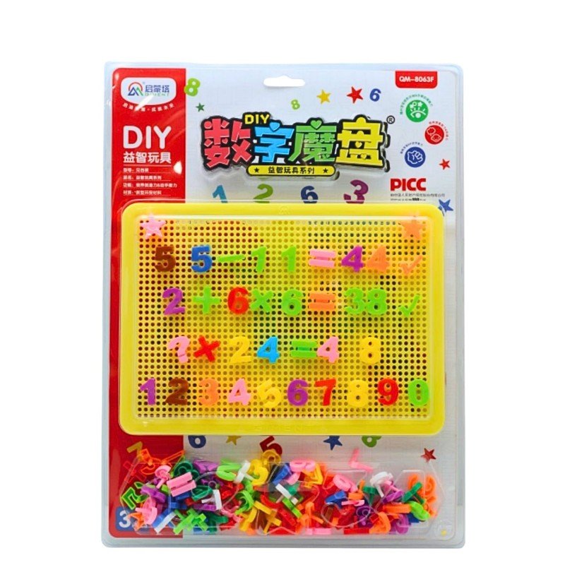لوحة تعليمية تفاعلية مصممة لمساعدة الأطفال على تعلم الأحرف الإنجليزية، الأرقام، والعمليات الحسابية الأساسية بطريقة ممتعة ومرئية. تأتي مع لوحة مثقبة وقطع ملونة قابلة للتركيب (DIY) تتيح للطفل تكوين الحروف، الأرقام، وعلامات الجمع والطرح والضرب بنفسه.