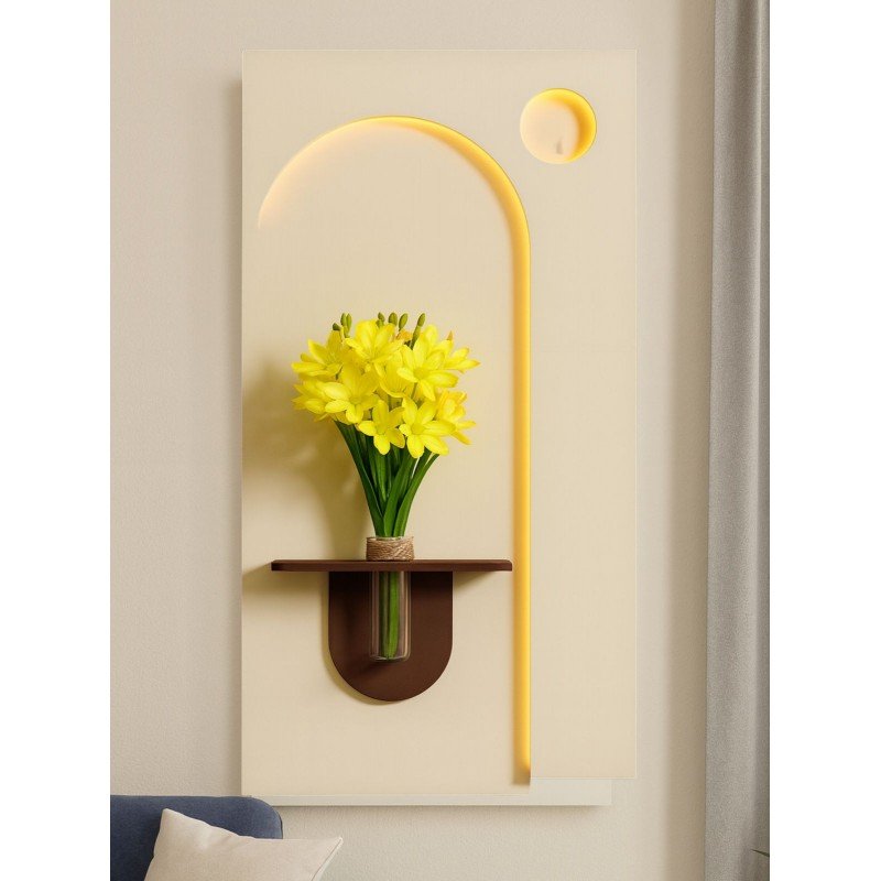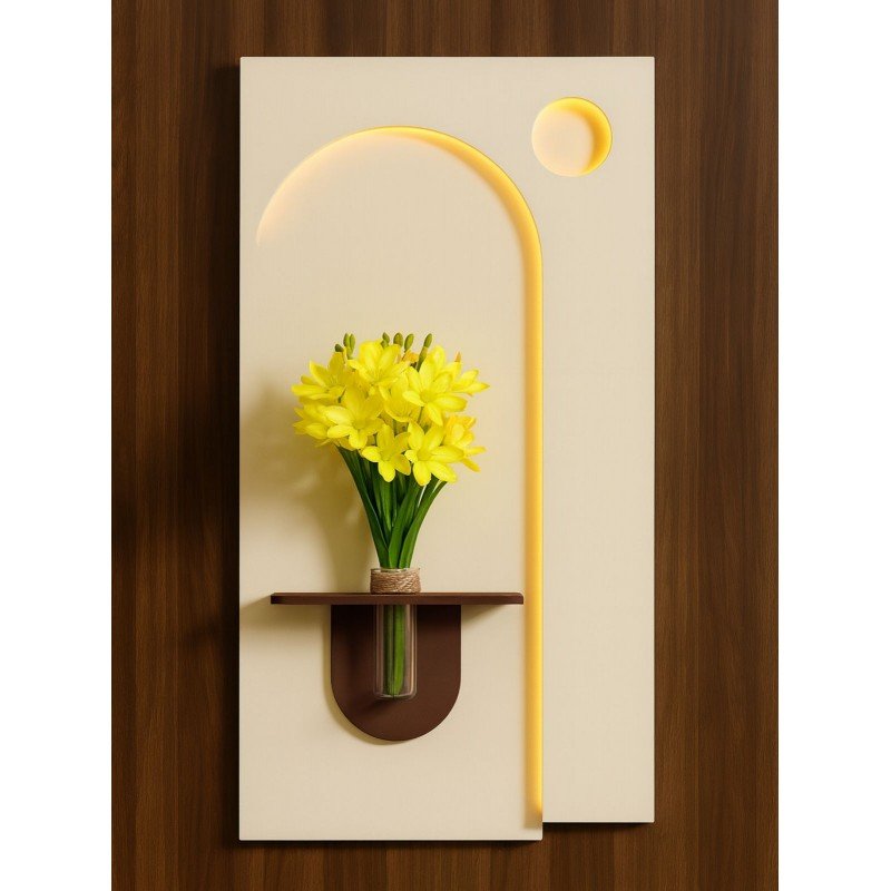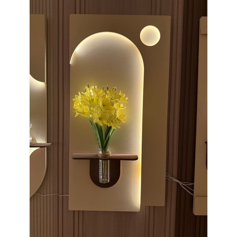 لوحة خشبية مضيئة بلمسة فنية أنيقة لوحة فاخرة تجمع بين الخشب المصقول والرمل المدهون لتمنحك مظهراً دافئاً وطبيعياً، مزودة بمزهرية زجاجية شفافة لإضافة لمسة ديكور ناعمة. تأتي مع ريموت للتحكم بالإضاءة ووصلة USB لتسهيل التشغيل. المقاس: 60×120 سم مثالية لتزيين الجدران وإضفاء أجواء راقية في غرف المعيشة أو المكاتب أو مداخل المنزل.