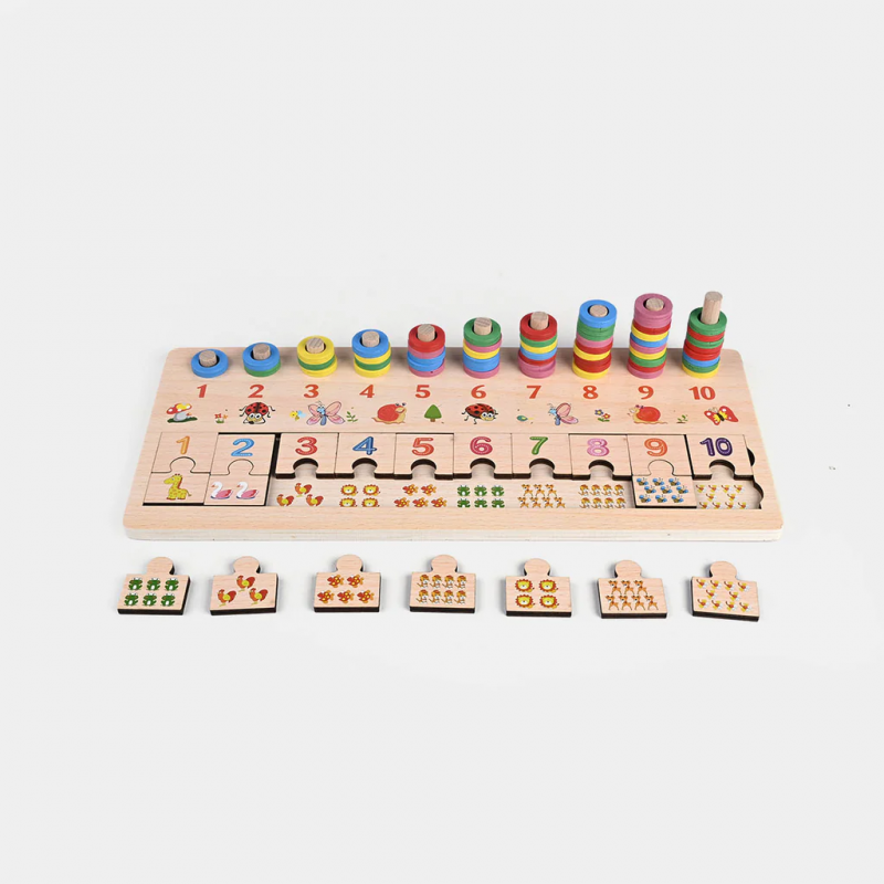 لعبة تعليمية خشبية تجمع بين التطابق والعدّ والتكديس في منتج واحد. تساعد الأطفال (3+ سنوات) على تعلّم الأرقام والحسابات البسيطة وتنمية المهارات الحركية الدقيقة والتنسيق بين العين واليد.