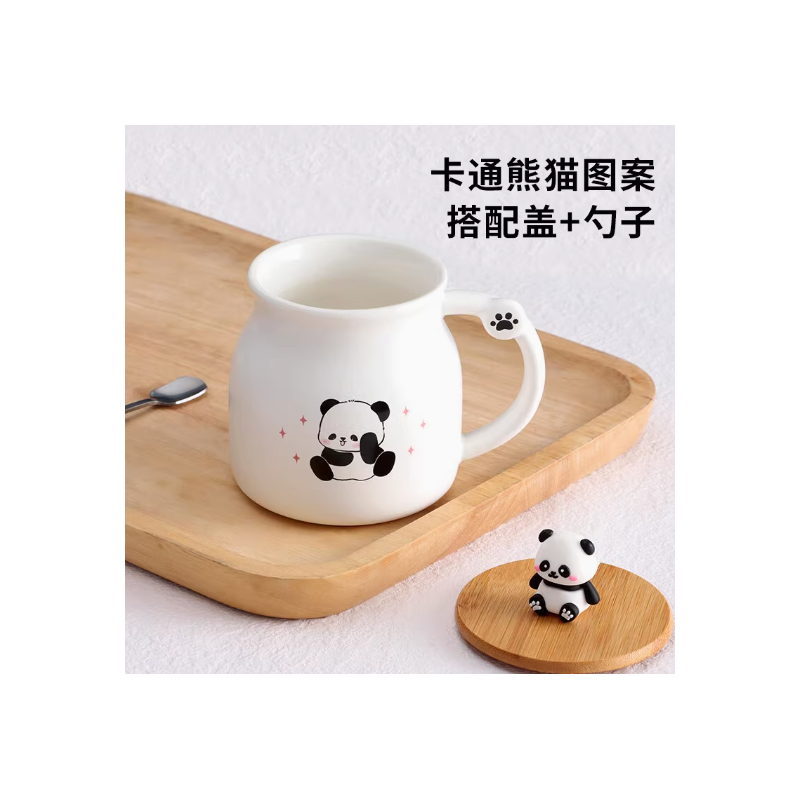 ✅مج بورسلان مع غطاء خشب بامبو وملعقة بتصميم دب الباندا