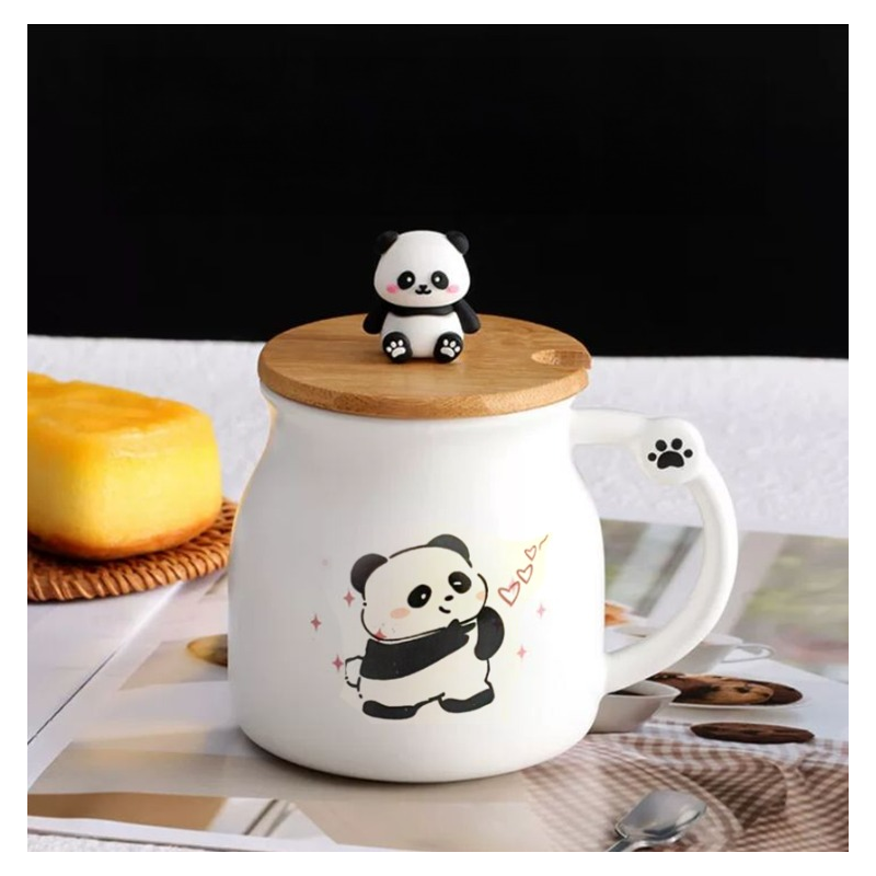 مج بورسلان مع غطاء خشب بامبو وملعقة بتصميم دب الباندا وقلب لون أبيض