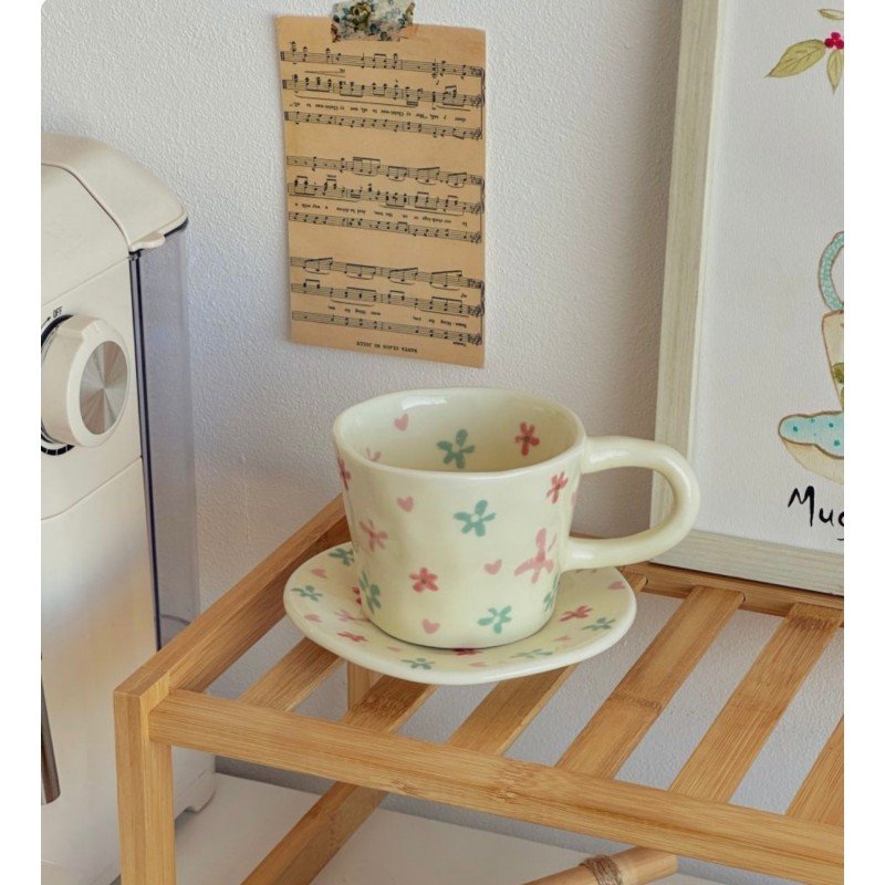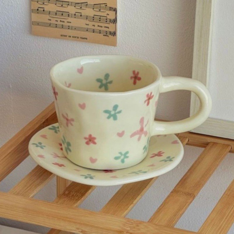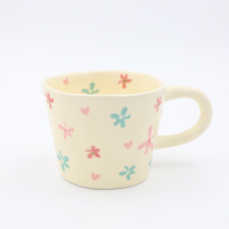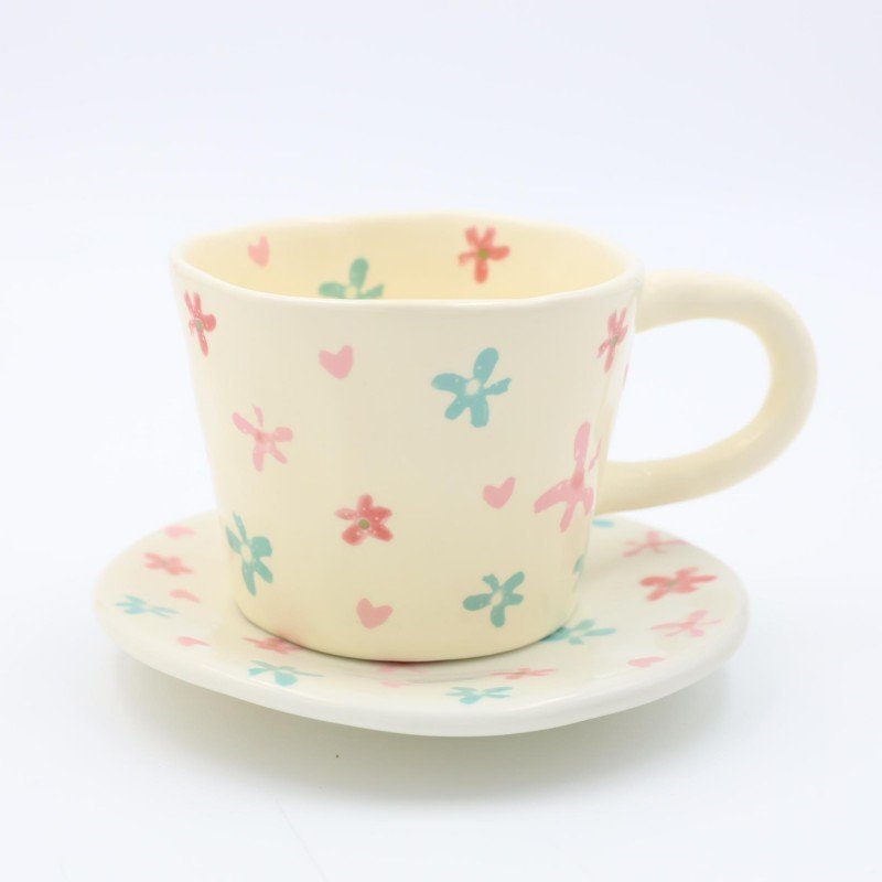 ✅ مصنوع من بورسلان عالي الجودة✅ تصميم لطيف مزين بنقوش ورود وقلوب بألوان هادئة✅ يأتي مع صحن متناسق بنفس النقشة✅ ملمس ناعم وشكل أنيق يناسب القهوة أو الشاي✅ مثالي للاستخدام اليومي أو كهدية جميلة لمحبي القطع الهادئة