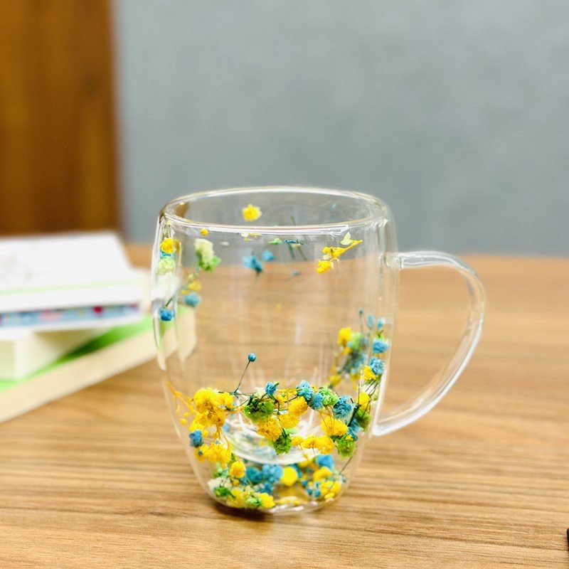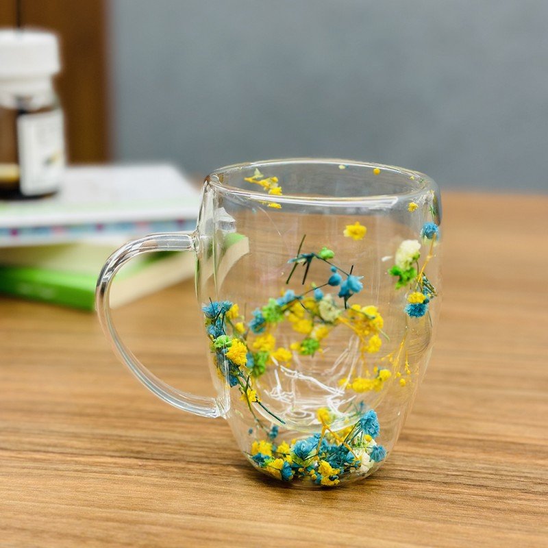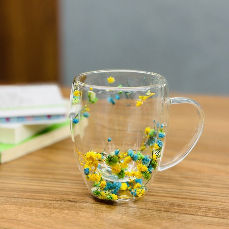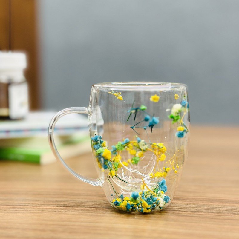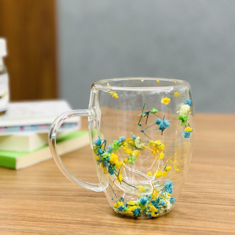 ✅مج دبل كلاس مزدوج الجدران ورد أصفر وأزرق سعة 350 مل