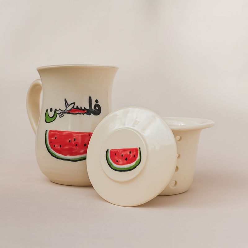 كوب اعشاب صنع على ايدي حرفين طله و هو عبار عن كوب و مصفه و غطاء بتصميم فلسطين و البطيخ 11*9 سم