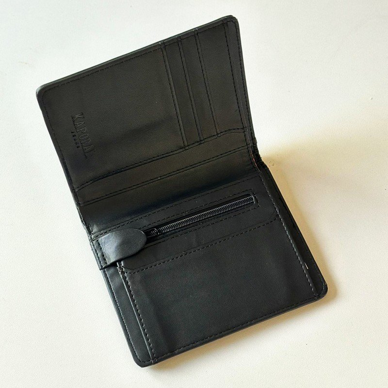 محفظة جلدية عملية بتصميم طيّ، مزودة بعدة فتحات للبطاقات، وجيب بسحاب لحفظ النقود المعدنية، بالإضافة لجيوب إضافية للنقود والفواتير. من الخارج تأتي بتصميم بارز بالنقش لمظهر فريد وعصري يسهل حمله في الجيب دون أخذ مساحة كبيرة.