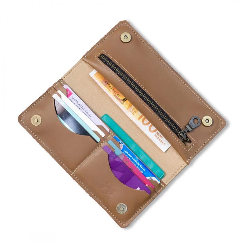 محفظة ستاتي من الجلد الطبيعي البقري، مطرزة بالتطريز الفلسطيني الأصيل.