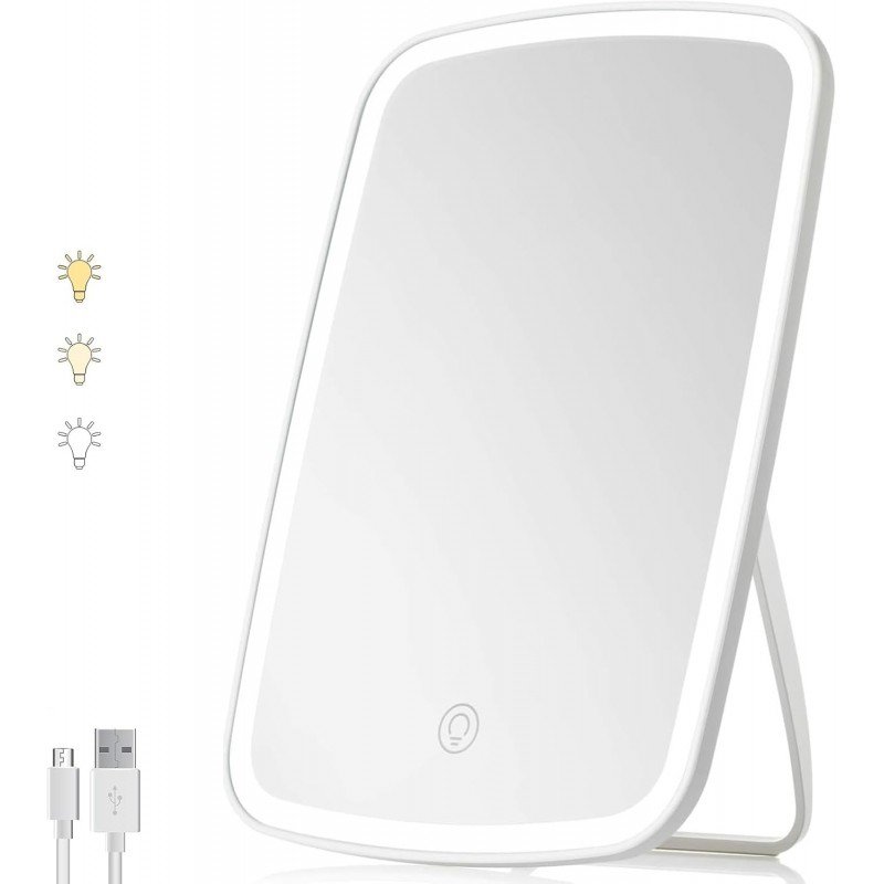 مرآة مكياج شاشة تعمل باللمس مع إضاءة LED ذات 3 مستويات وحامل قابل للطي، مرآة مربعة الشكل