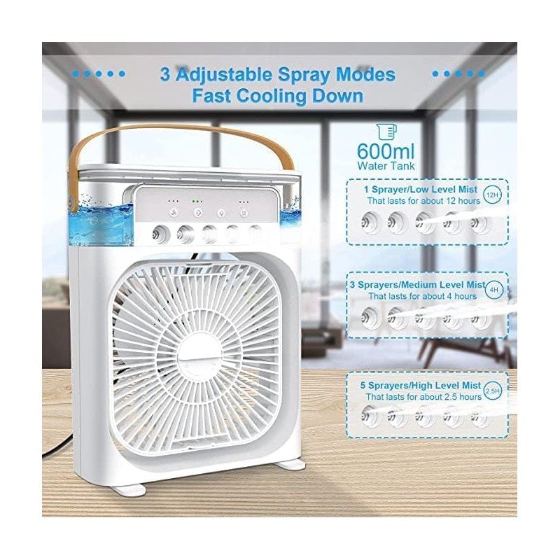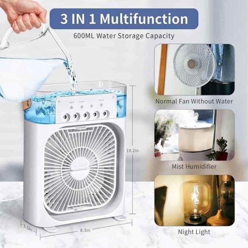 المميزات:  ✅مروحة مكتبية مع رذاذ ماء للتبريد.  ✅يمكن لمبرد الهواء المحمول هذا إطلاق رذاذ الماء من خلال الثقوب الموجودة فيه والتي يمكن أن تخفض درجة الحرارة بسرعة وفعالية.  ✅يمكنك إضافة الماء ومكعبات الثلج إلى خزان المياه لتعزيز تأثير التبريد والاستمتاع بالهواء البارد كما أن لديها وضع صامت يعدل سرعة المروحة ومستوى الصوت.  ✅باستخدام مبرد الهواء المحمول هذا يمكنك الاستمتاع بعمل ونوم هادئ دون أي اضطراب.  ✅الأبعاد: طول 24 سم× 18 سم
