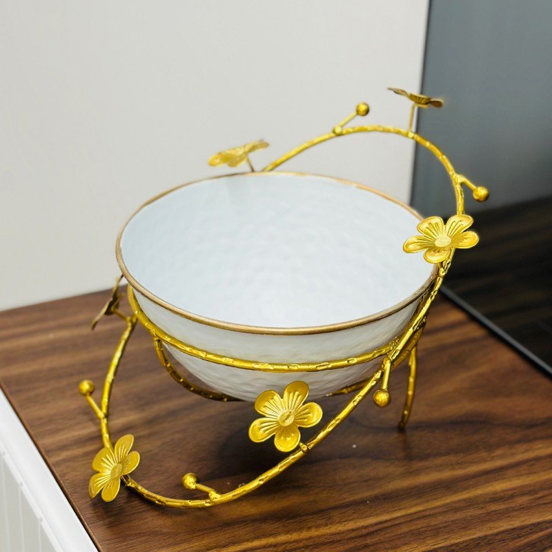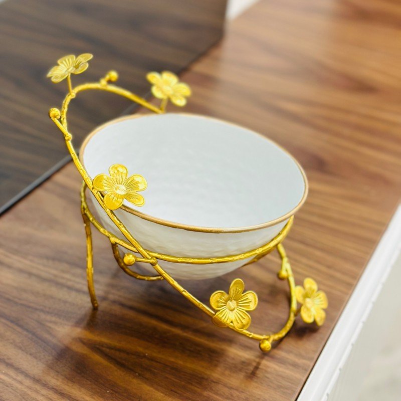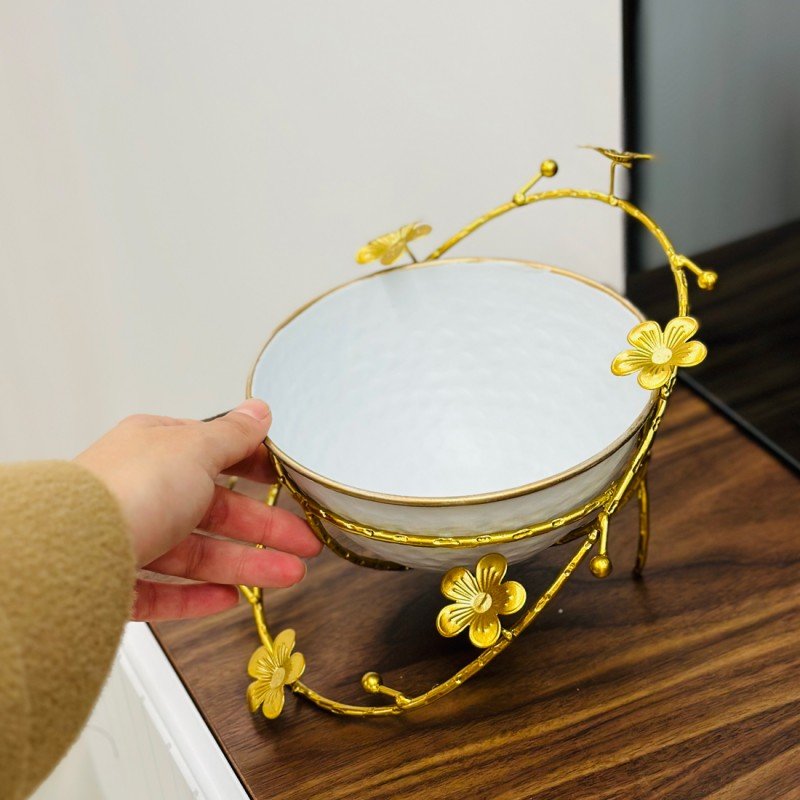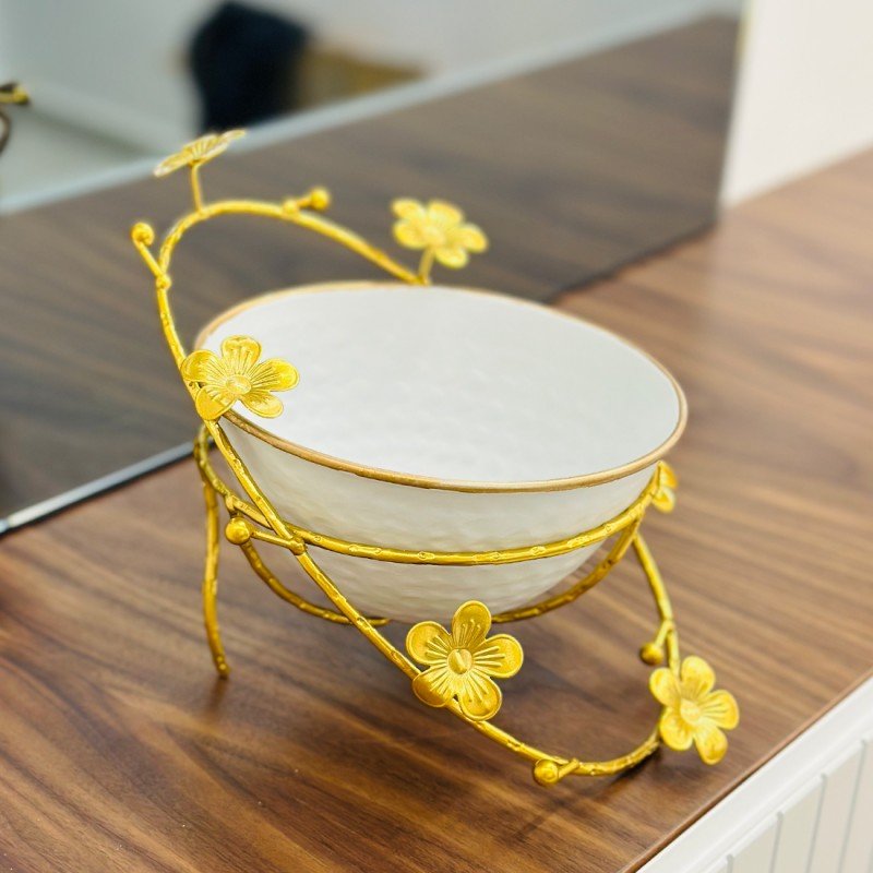 مضيفة سيراميك مع ستاند معدني – أناقة تجمع بين الأبيض والذهبي
