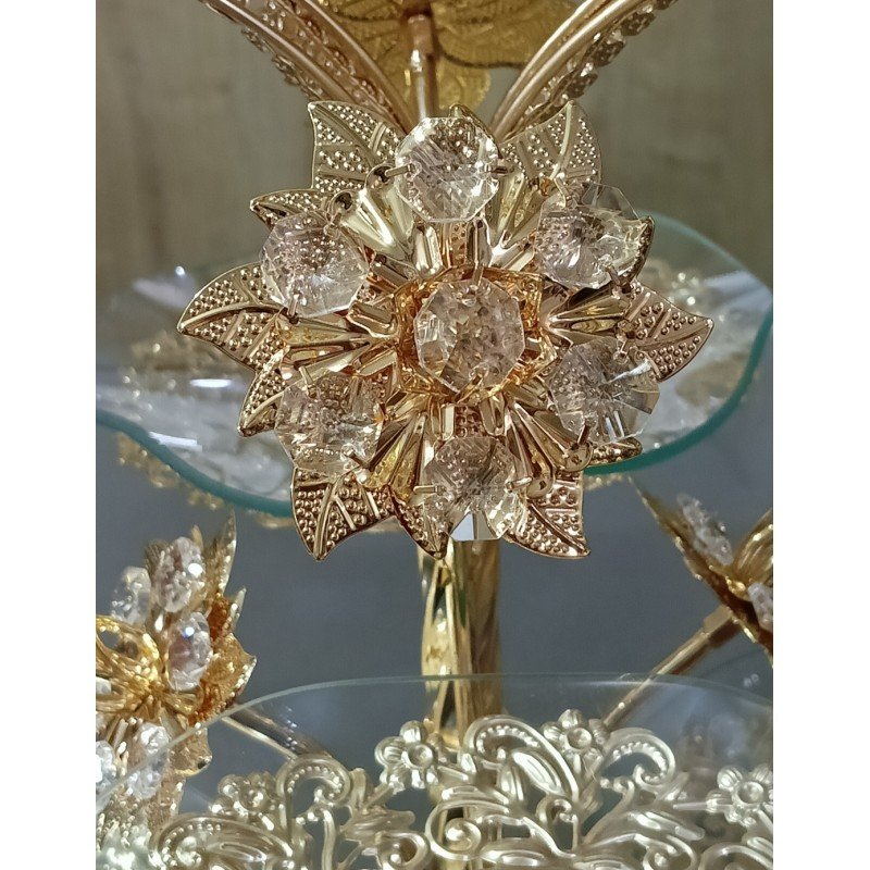 قطعة العرض الفخمة هذه ستكون إضافة رائعة لطاولة مناسبة أو حدث خاص، حيث ستضفي لمسة من الرقي والبهرجة على تقديم الحلويات والكعك. تصميمها المزخرف يجعلها قطعة ديكورية بارزة وعملية في الوقت نفسه.