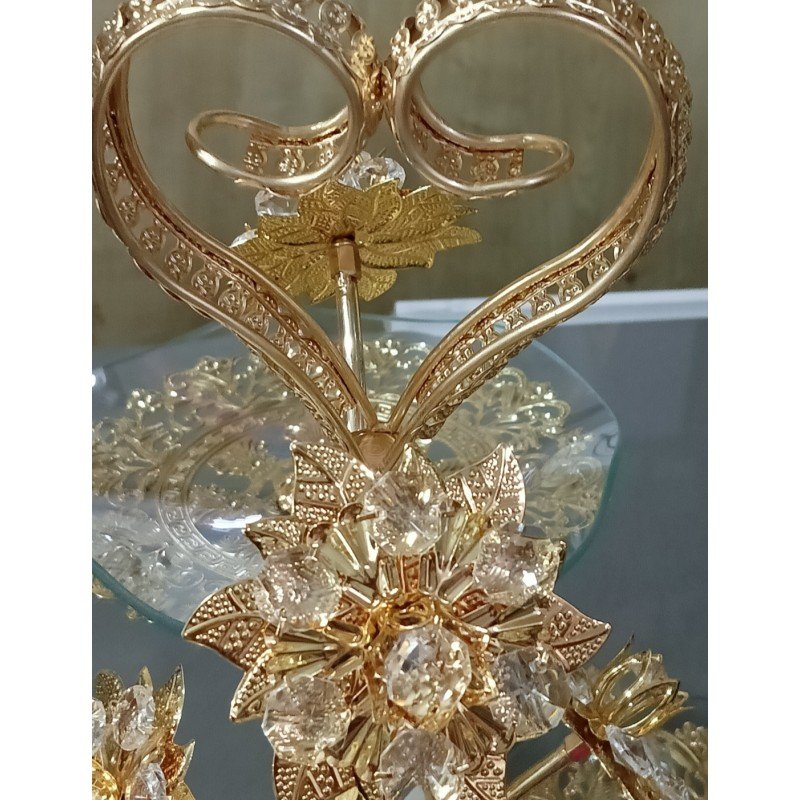 النقطة المركزية للتصميم هي العنصر المفتوح بشكل قلب في الجزء العلوي، والذي تتوجه عليه أزهار معدنية ذهبية اللون. يعطي هذا المزيج بين الزجاج الشفاف والتفاصيل المطلية بالذهب إحساسًا بالفخامة والأناقة المتميزة.