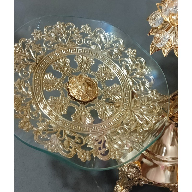 تُظهر مضيفة أو قطعة عرض ذات تصميم فاخر مصنوعة من الذهب والزجاج. تتميز القاعدة بزخارف ذهبية مزخرفة برقيقة ونقوش نباتية دقيقة. وفوقها يوجد طبق زجاجي مدعوم بهيكل معدني مذهب بتفاصيل زخرفية غنية.