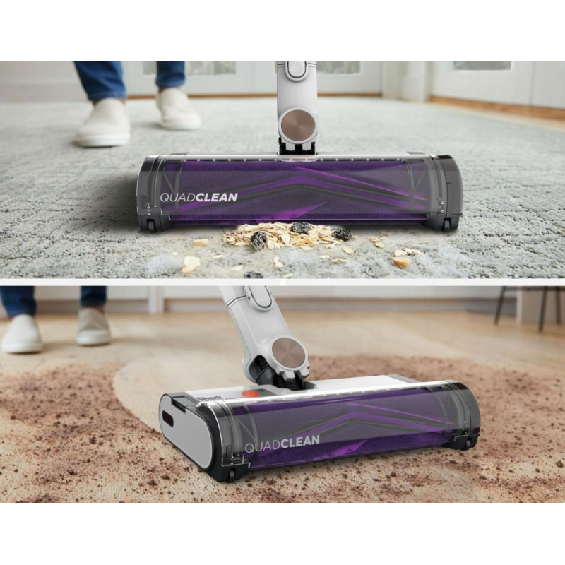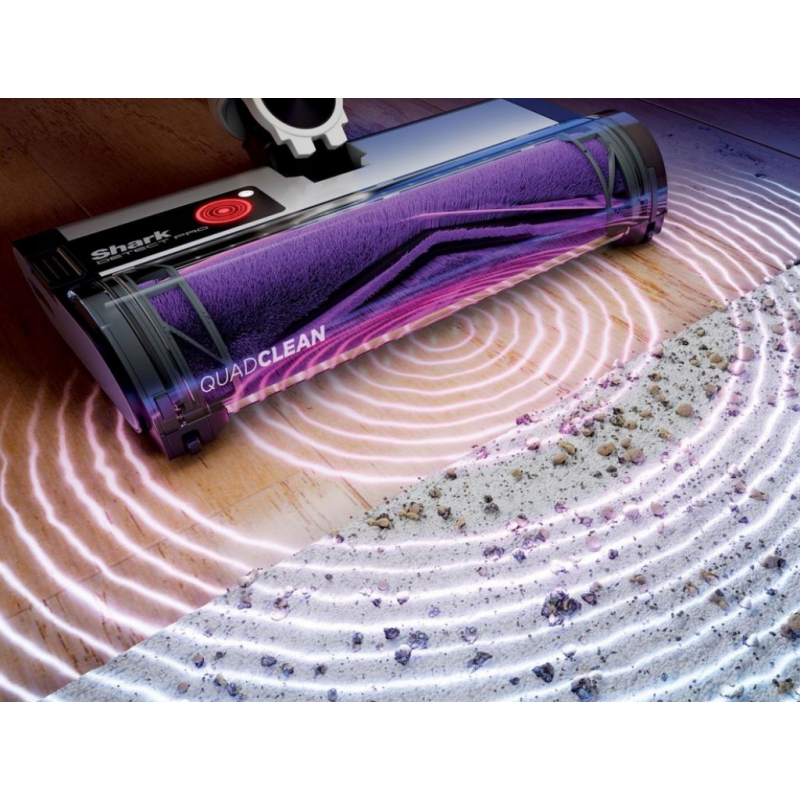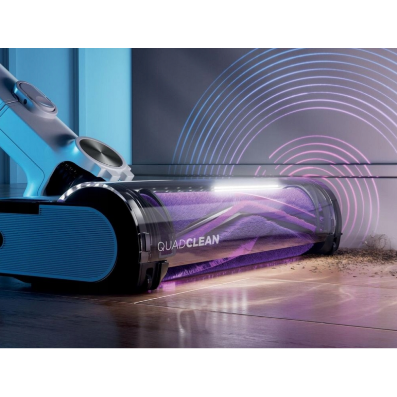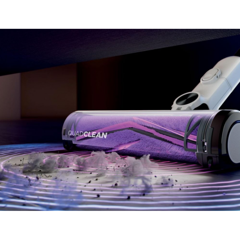 The QuadClean multi-surface brush-roll deep cleans all floor types – with no swapping. This unique design features a raised front edge to pull in large particles, carpet fins to lift embedded dirt and hair, agitation ribs to loosen fine dirt, and soft microfibre to capture fine dust.