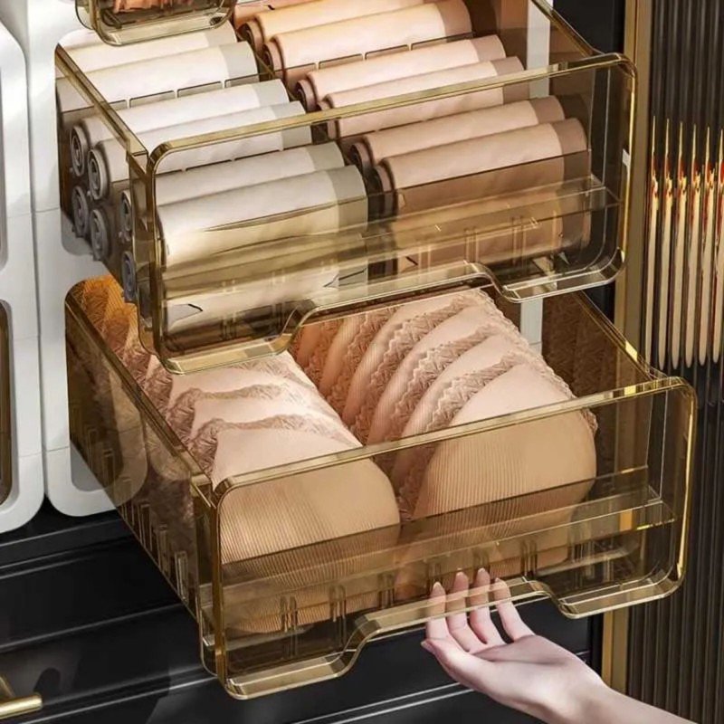 تصميم عصري بأدراج شفافة لتسهيل رؤية المحتويات. يحتوي على خيارات تقسيم: بدون تقسيم (للطبقات الأكبر). درج بـ 10 خانات للملابس الداخلية. درج بـ 15 خانة للجوارب أو الإكسسوارات. يساعد على تنظيم الخزانة واستغلال المساحة بذكاء. مصنوع من مواد متينة وسهل التنظيف. يمكن تكديسه فوق بعضه لزيادة السعة التخزينية.
