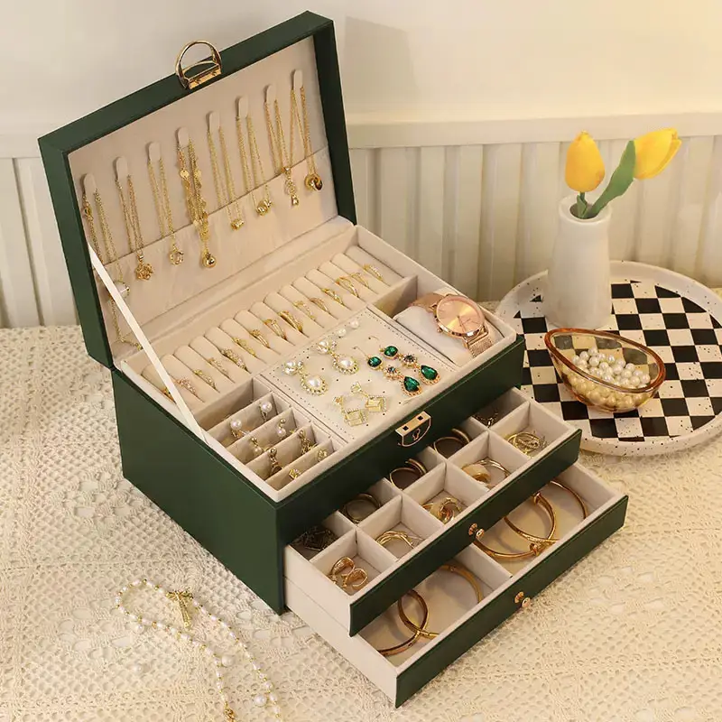 منظم اكسسوارات من الجلد الطبيعي، مزود بقفل محكم الإغلاق وجرارين لحفظ الاكسسوارات