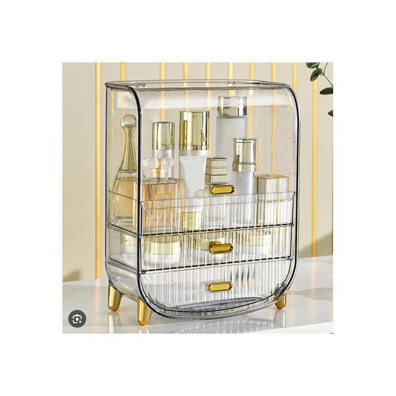 منظم مكياج ومستحضرات مصنوع من الأكريليك الشفاف والذهبي، لتوفير مساحة وتنظيم الاغراض بشكل لافت