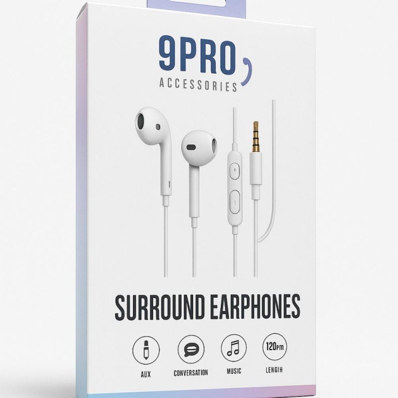 سماعات 9Pro محيطية سلكية بتوصيل AUX بطول كابل 1.2 م توفر صوتاً واضحاً ومتوازناً يناسب الاستماع إلى الموسيقى، المكالمات، ومشاهدة الفيديوهات عبر الأجهزة المزودة بمقبس 3.5 مم. تأتي هذه السماعات بتصميم أبيض أنيق وخفيف الوزن لراحة الاستخدام اليومي في المنزل، المكتب، أو أثناء التنقل.