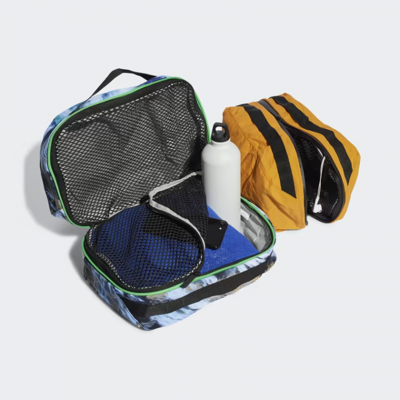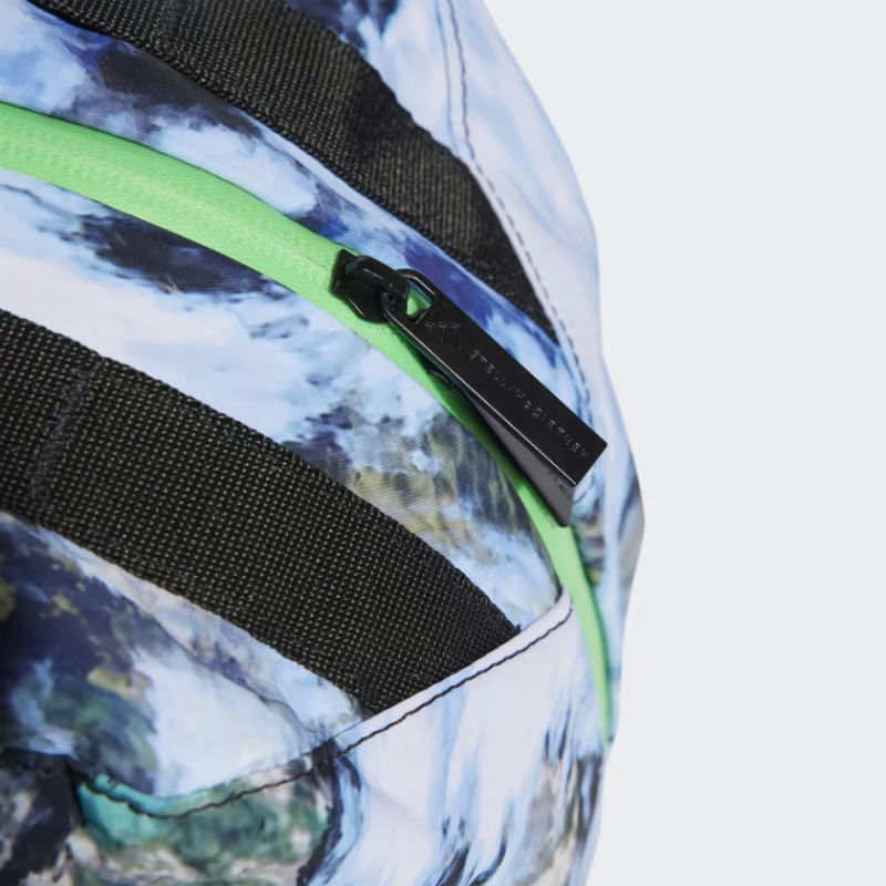 Travel becomes a lot easier, and a lot more organised, with this adidas by Stella McCartney travel bag set. There are two bags in different sizes — one for your shoes, and one for your apparel. Which means your running shoes stay separate from your gear, and your gear stays a lot more fresh. The print is an extension from the rest of the collection, with different patterns representing different points of view on nature. Here we look down from above, taking inspiration from weather satellites over the ocean.