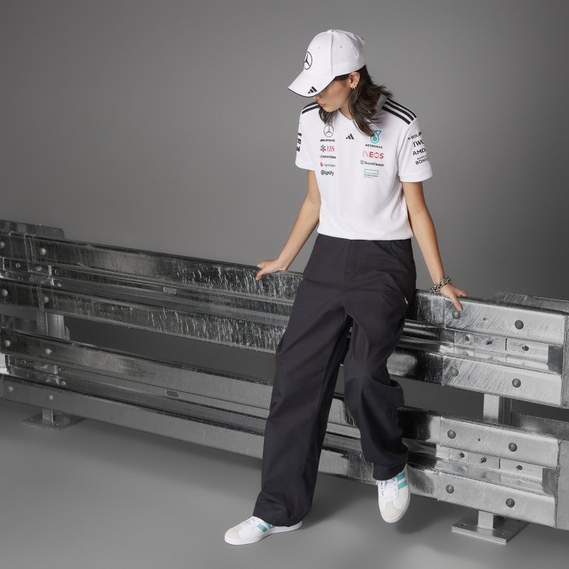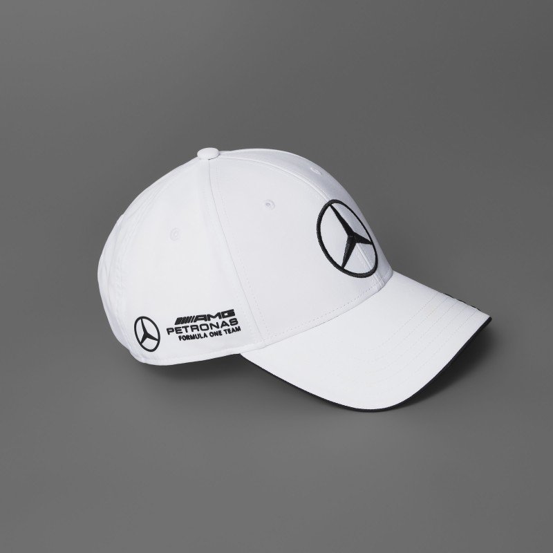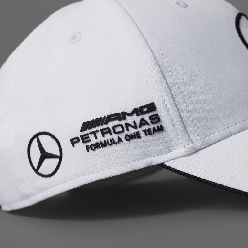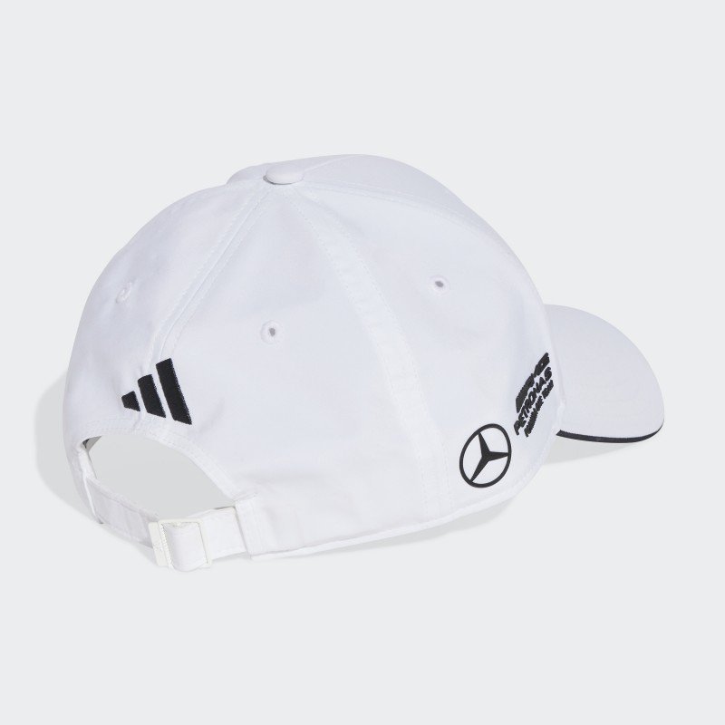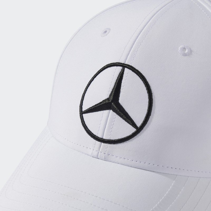 قبعة مميزة تجمع بين الراحة والأناقة، بلون أبيض ناصع مع تطريز شعار مرسيدس باللون الأسود لإطلالة راقية وعصرية.