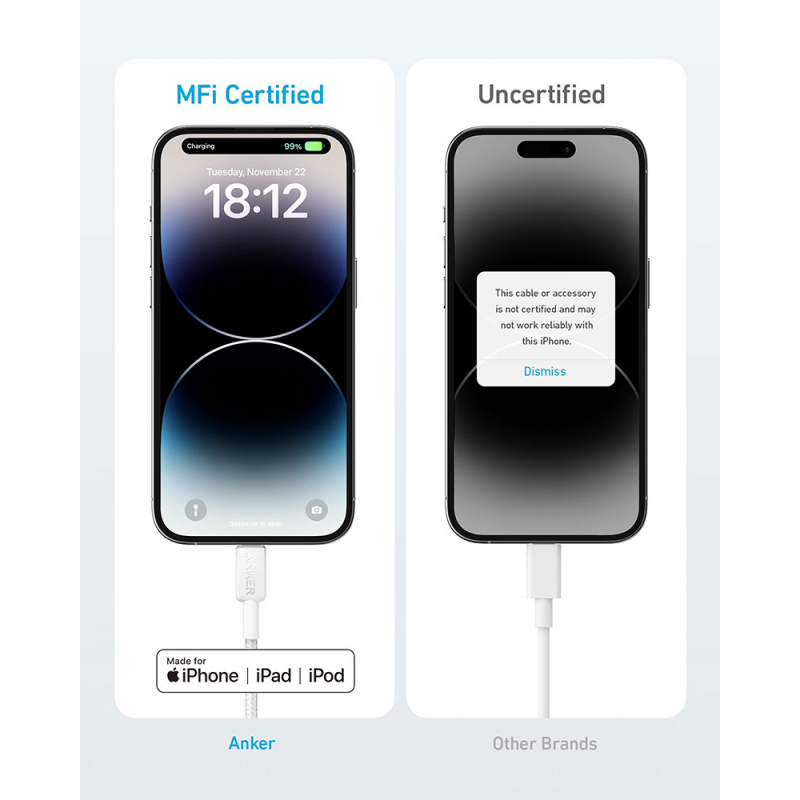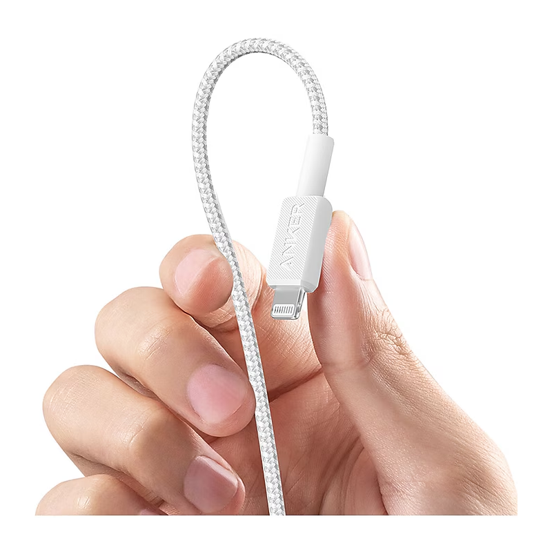 كابل Anker 322 USB-C إلى Lightning بطول 6 أقدام وباللون الأبيض، مصمم لتقديم شحن سريع وموثوق لأجهزتك. يتميز هذا الكابل بمتانته العالية بفضل تصميمه المجدول، مما يضمن تحمل الاستخدام اليومي المكثف. مع شهادة MFi من Apple، يضمن الكابل توافقًا تامًا مع أجهزة iPhone وiPad، مما يوفر شحنًا آمنًا وسريعًا في كل مرة. عند استخدامه مع شاحن متوافق مع تقنية Power Delivery، يمكن للكابل شحن جهاز iPhone 14 Pro حتى 50% في غضون 30 دقيقة فقط. تم اختباره في المختبرات لتحمل ما يصل إلى 12,000 انحناء، مما يعكس جودته ومتانته الفائقة.