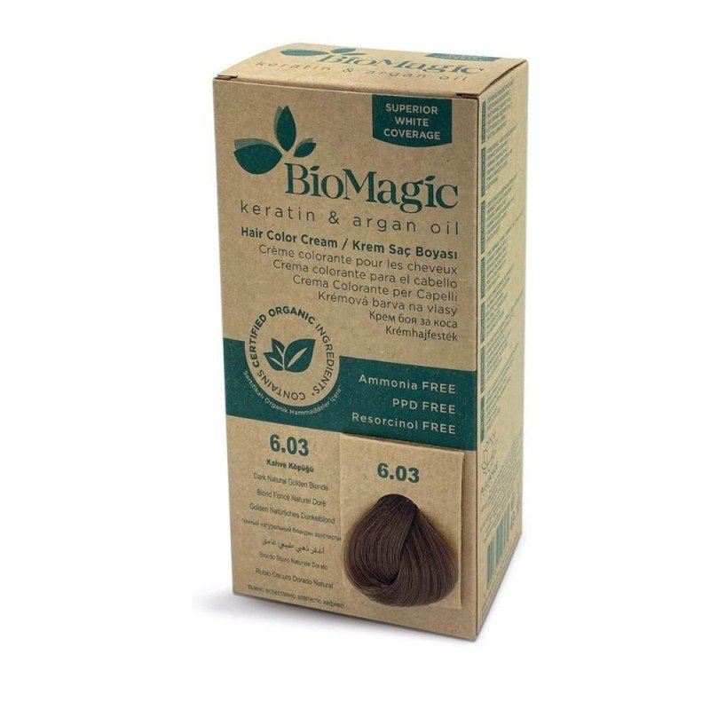 كريم تلوين الشعر بيوماجيك منتج مبتكر تمامًا. صُممت تركيبته الخاصة لتلبية احتياجات فروة الرأس الحساسة؛ فهو خالٍ من الأمونيا والريزورسينول والبارابين. تساعد مكونات زيت الأرغان والكيراتين على حماية بنية الشعر من الشيخوخة والتلف الخارجي. بفضل مكوناته العضوية، تمنح التركيبة الشعر حيوية ولمعانًا، وتضمن تغطية مثالية للشعر الرمادي.