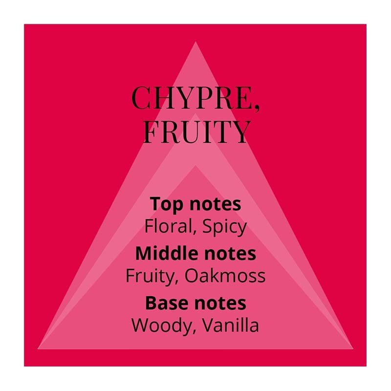 Colour Me Red Milton Lloyd عطر تشيبر – زهري للنساء . إفتتاحية العطر رائحه التوابل, الفريزيا, الفاوانيا و البرغموت; قلب العطر التوت الأحمر, طحلب البلوط (طحلب السنديان), البنفسج, الياسمين و زهر القرنفل; قاعدة العطر تتكون من نجيل الهند, جذور السوسن, خشب الصندل و الفانيليا.||