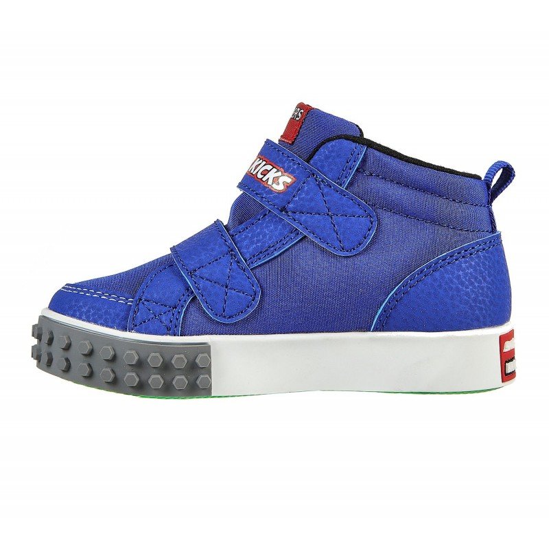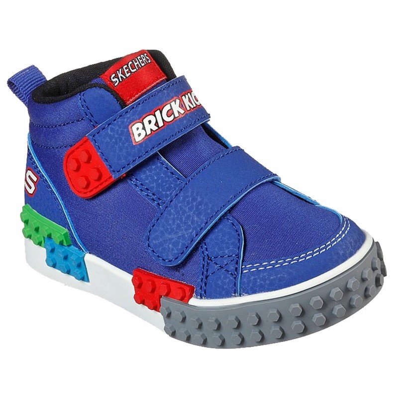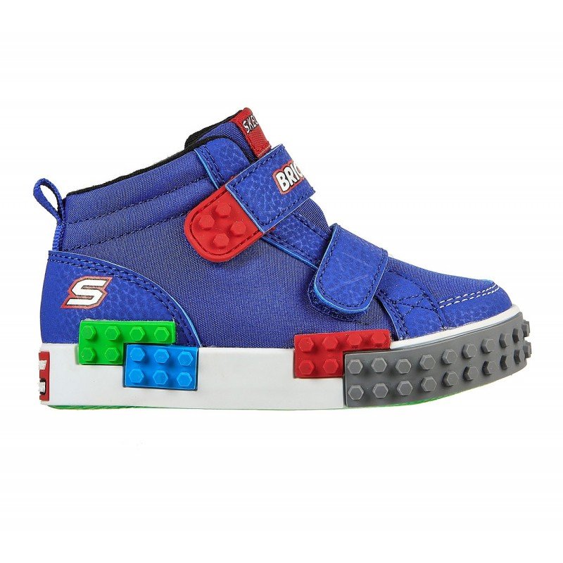 Colorful fun starts with the SKECHERS Brick Kicks: Kool Bricks – Lil Constructor shoe. Soft fabric and synthetic upper in a two strap front sporty casual mid top sneaker with colorful building-brick texture detailing.