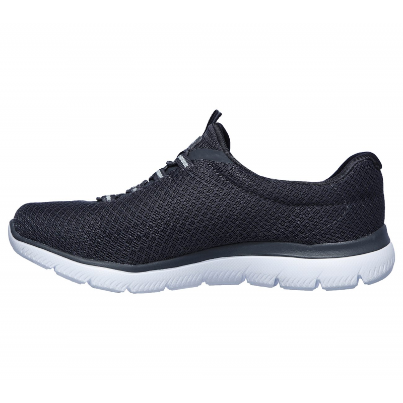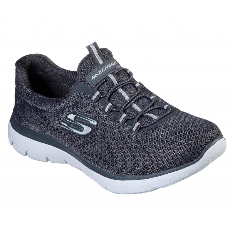 Reach the height of comfort with the Skechers Summits shoe. This slip-on sneaker features a soft flat mesh knit upper with a bungee-laced front and cushioned Memory Foam comfort insole.