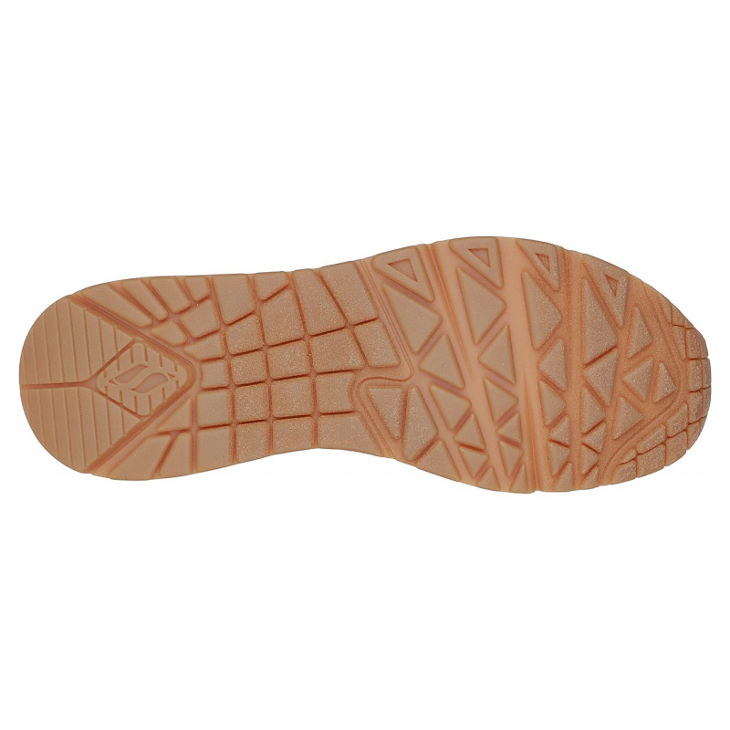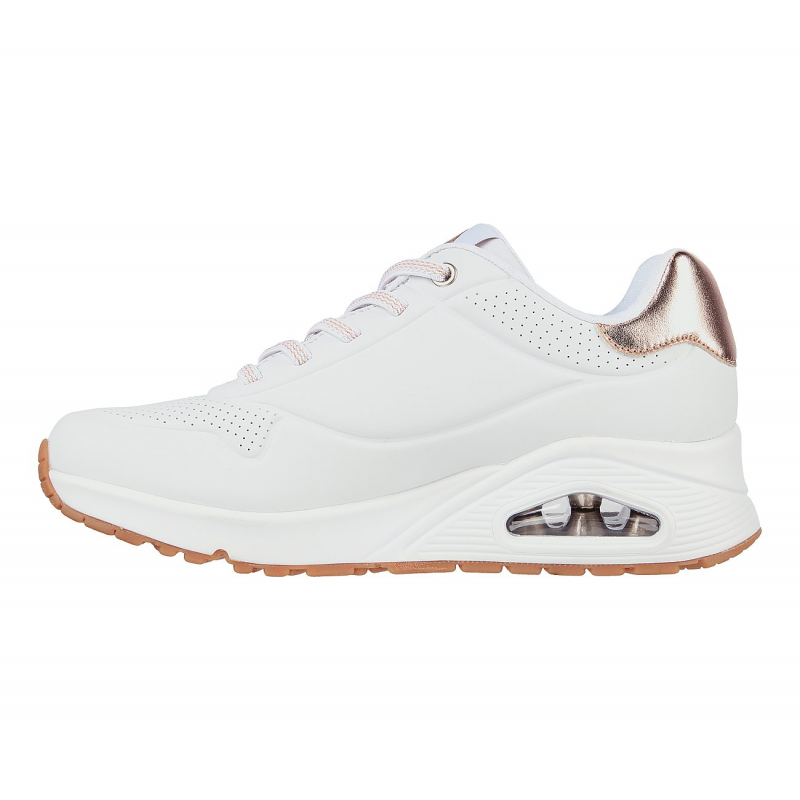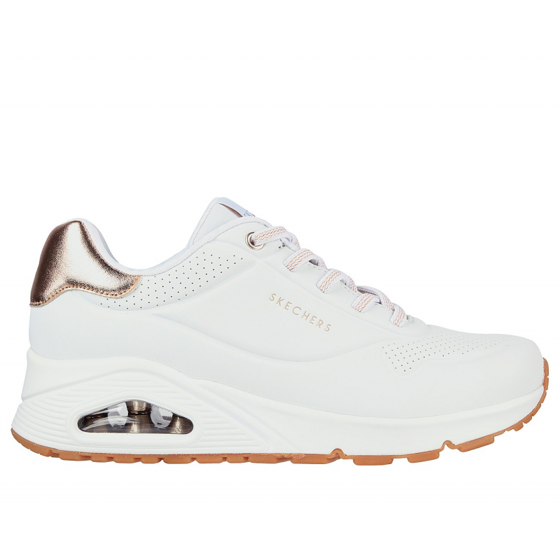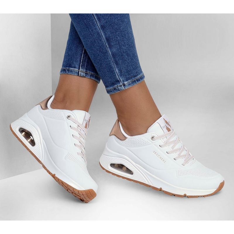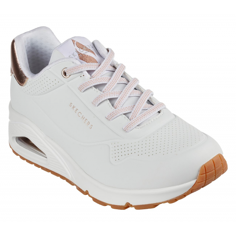 Enjoy a classic style this season wearing Skechers Street™ Uno – Shimmer Away. This wedge fit fashion sneaker features a synthetic durabuck upper with metallic heel trim, stretch laces, a Skechers Air-Cooled Memory Foam® insole, and a Skech-Air® visible airbag midsole.